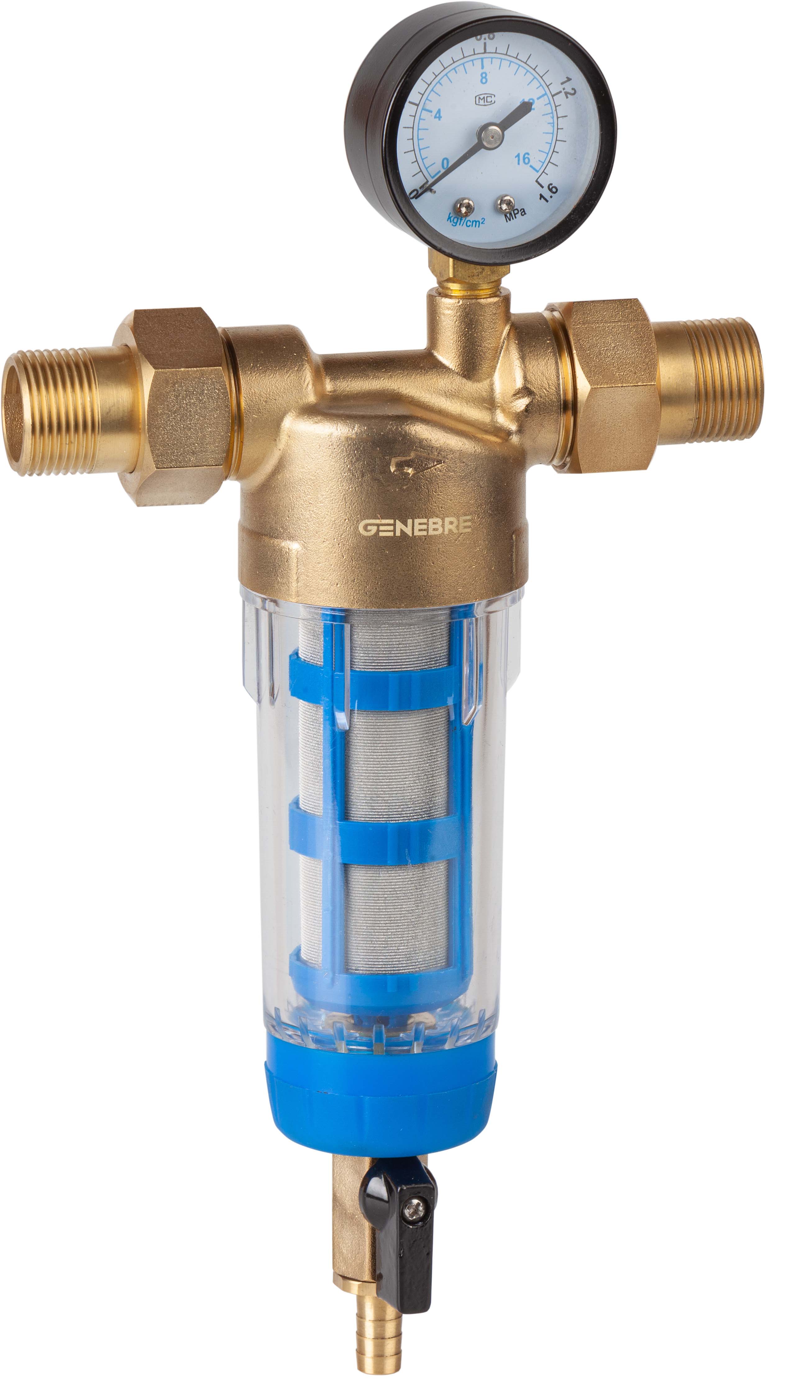 PN 16. Construcción en latón UNE-EN 12165. Tamiz de acero inox AISI 316. Luz 45 micras. Cuerpo extremos roscados (BSP) M-M 1" según ISO 228/1. Racor reducción 1" x 3/4" incluido. Manómetro 0 - 16 bar y válvula de vaciado. Temperatura máxima de trabajo 80ºC.