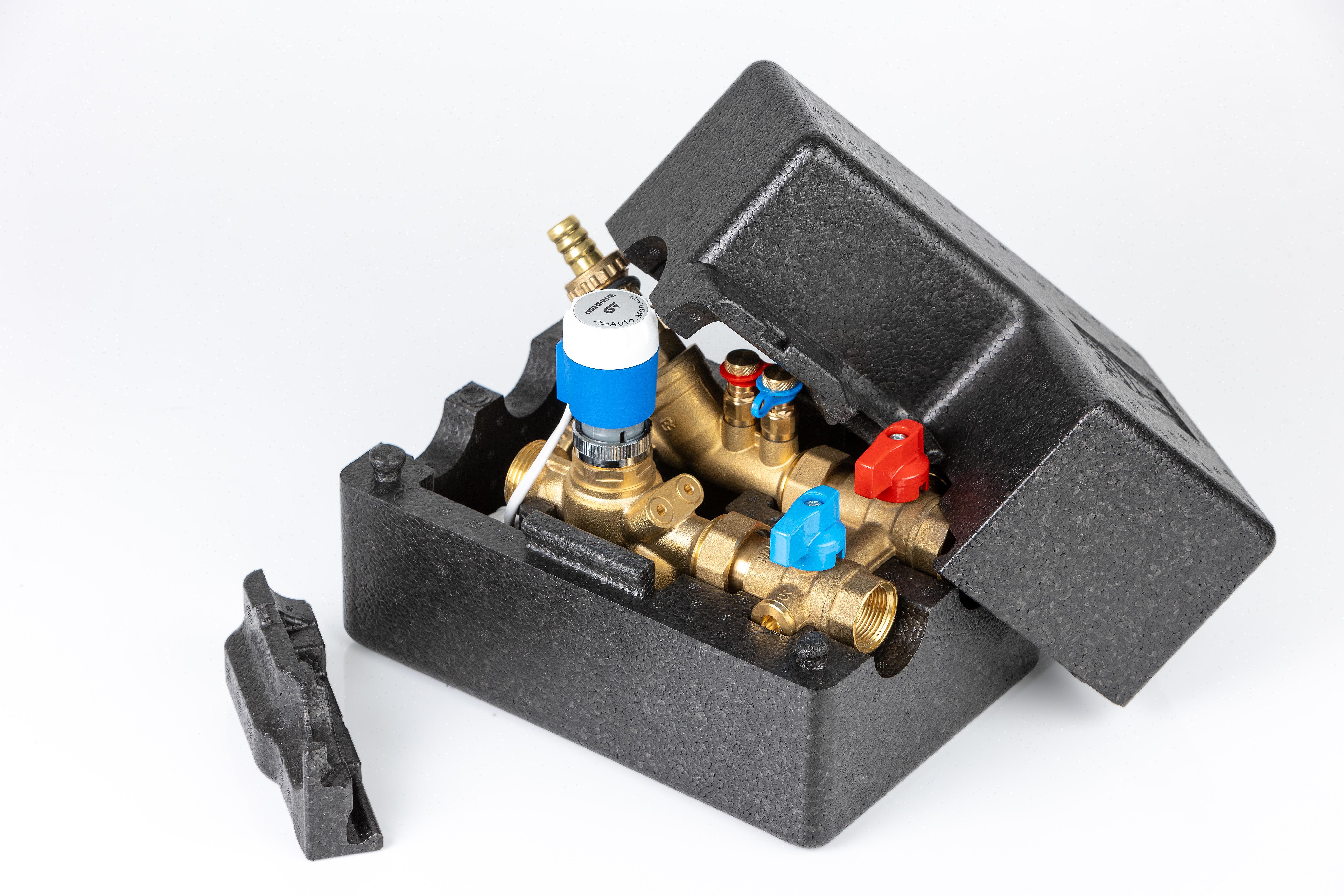 PN25. Construcción en latón DZR, según UNE-EN 12165. Asientos de PTFE y EPDM PEROXIDO. . Extremos rosca gas (BSP) ISO 228/1. Rango de temperatura -10ºC a 120ºC. La unidad FCU se compone de una válvula de control PICV motorizada, 24VAC o 230VAC, un filtro tamiz de 800 micras con punto de drenaje, válvulas de aislamiento con by-pass y una estación venturi con tomas de presión P/T. Caja de aislamiento de polietileno incluida.