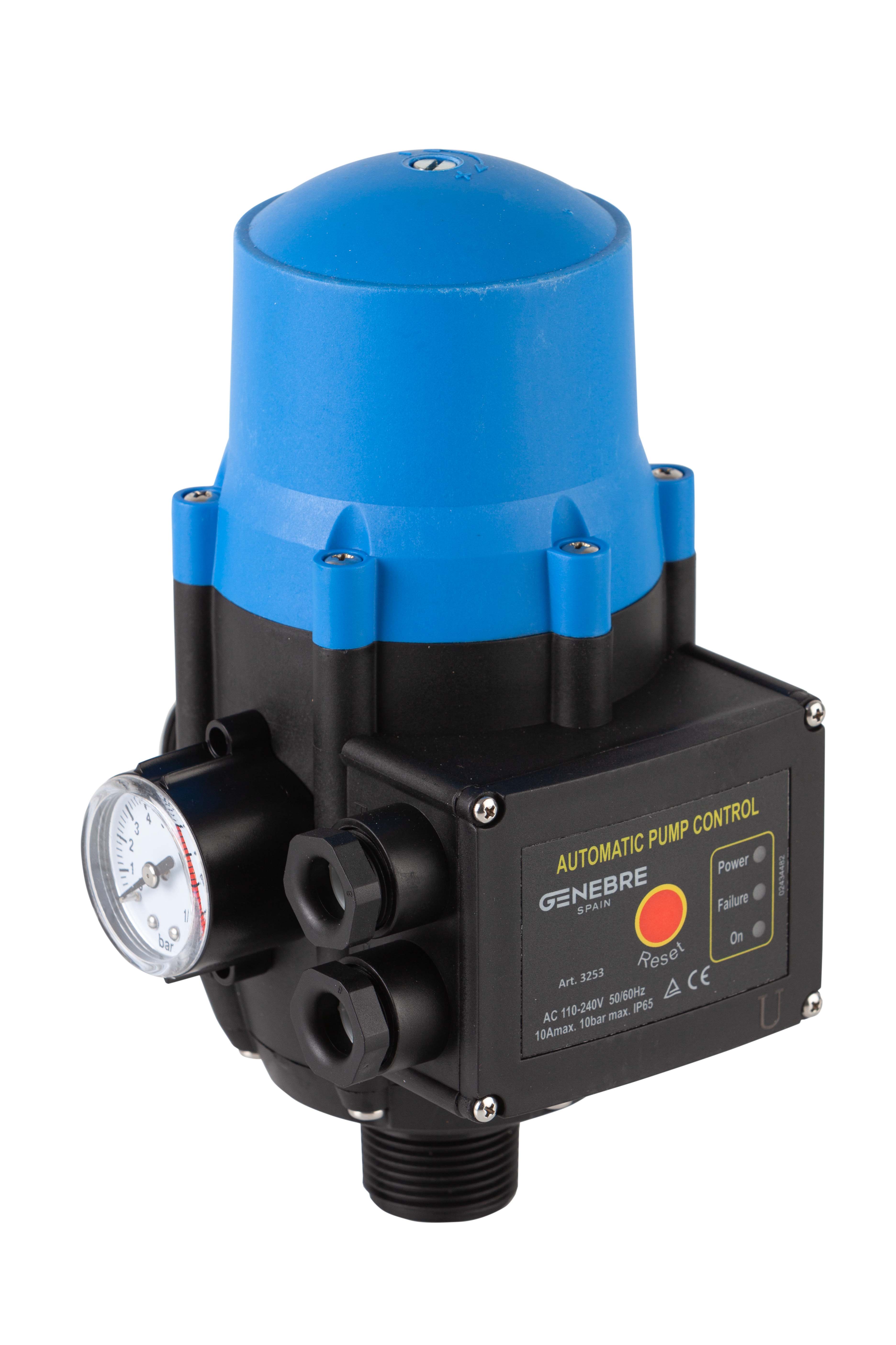 Para activar/desactivar el funcionamiento de una bomba en instalaciones y suministros. Tensión de conexión 110V-220V 50-60Hz. Intensidad máx. 10(6)A. Presión de arranque ajustable entre 1,5- 3 bar. Potencia 1,5 CV. Máx. presión de trabajo 10 bar. Máx. temp. trabajo 60ºC. Protección IP 65. Manómetro 0-10 bar incorporado.
